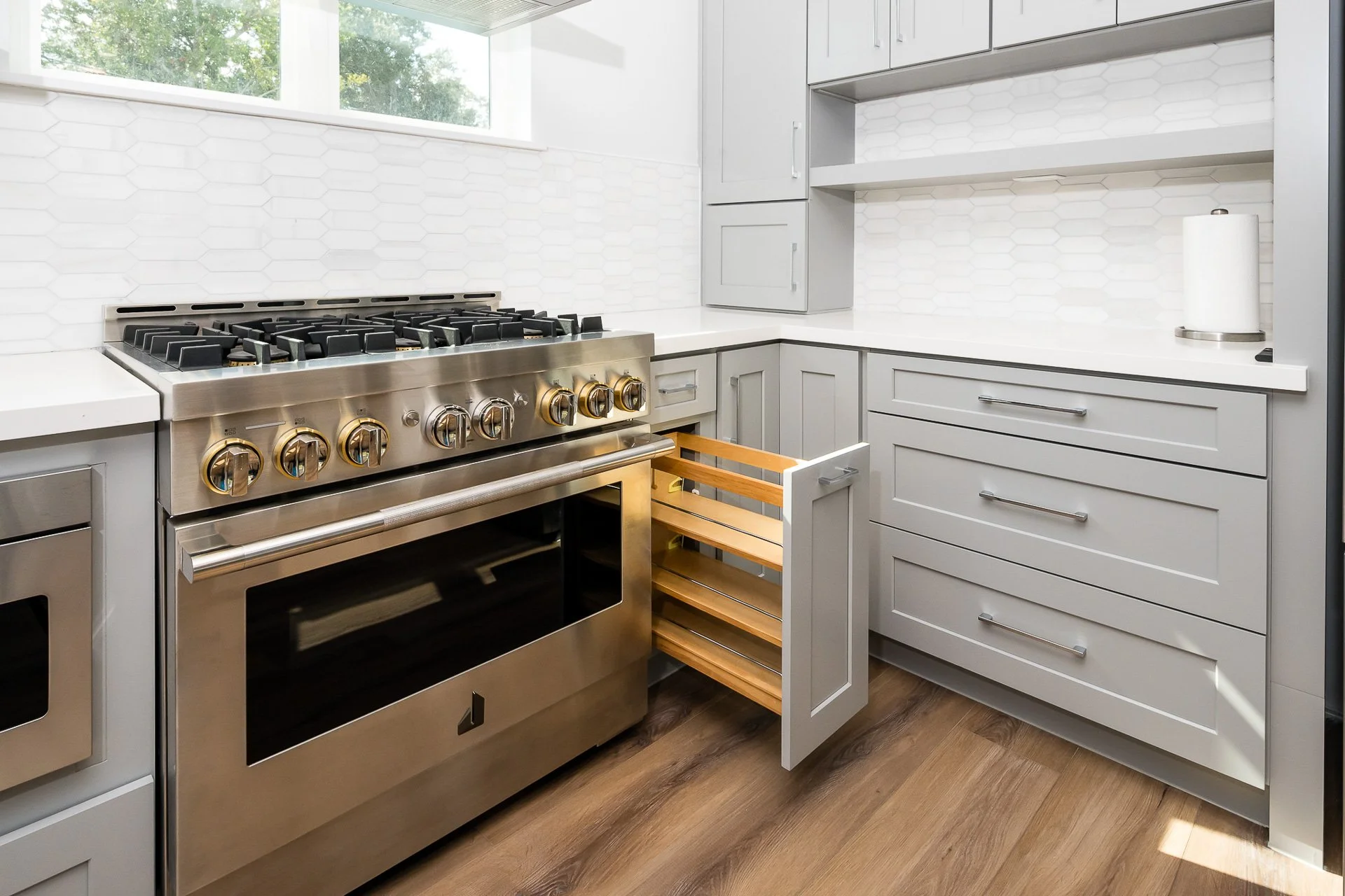 In this project, however, usage is lighter, and maintenance was addressed proactively. The higher backsplash and a properly sized, exterior-vented hood work together to capture cooking byproducts efficiently before they spread. In practice, maintenance here is no more demanding than in many traditional kitchen layouts.